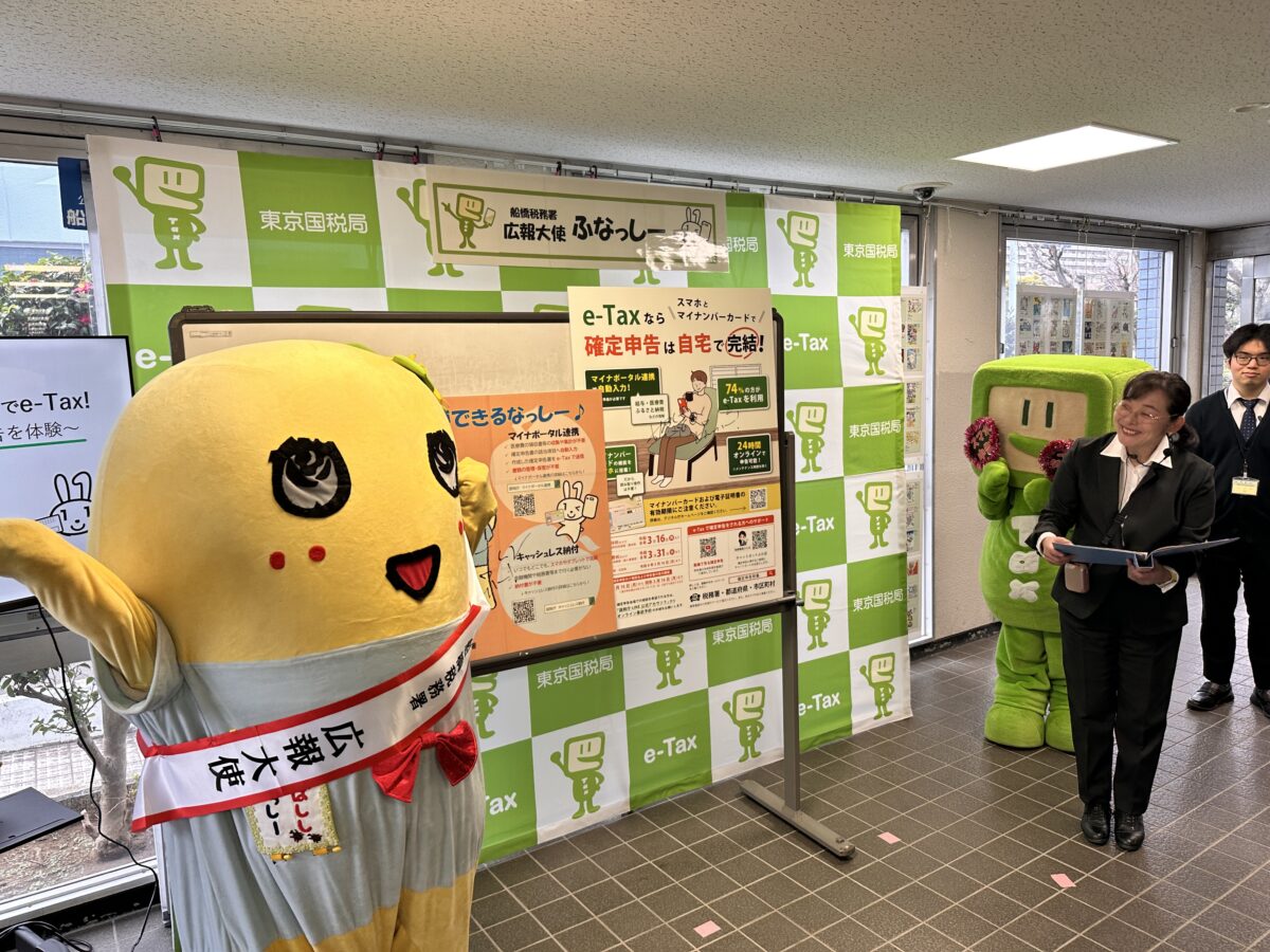 イベントでは、ふなっしーがスマートフォンを操作しながら医療費控除やふるさと納税に関する確定申告書を作成。マイナポータルとの連携により証明書の自動入力が可能であることや、申告の所要時間が大幅に短縮されることを体験を通して示した。