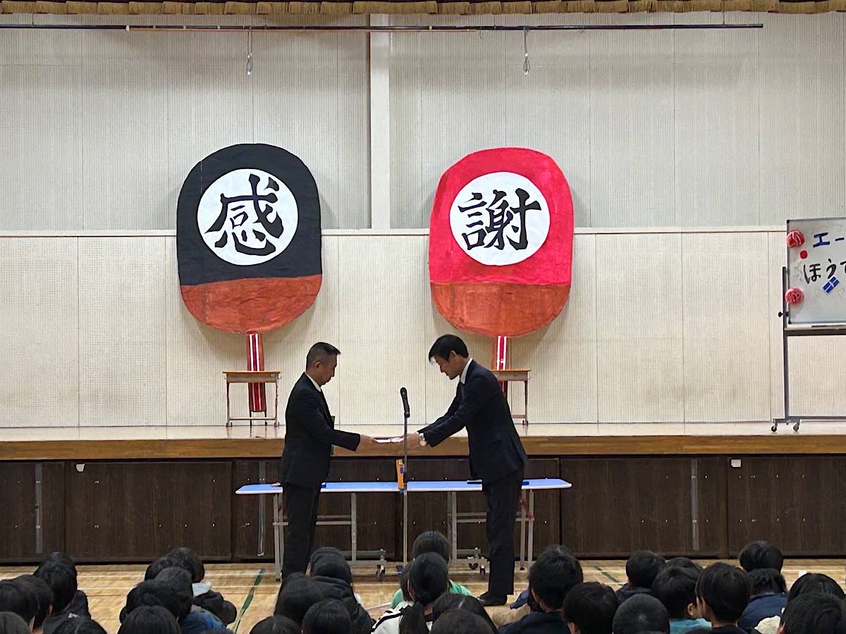児童約150人が参加した寄贈式では、中野誠校長と常務執行役員であり事業推進本部長の松本顕さんによる目録贈呈授与の後、松本部長が「子どもたちの安全を最優先した卓球台を、末永くみんなで楽しく使っていただけると嬉しい。またTリーグでは3月まで今シーズンの試合があるが、1位とわずかな差で優勝を目指して頑張っている『日本ペイントマレッツ』を応援してほしい」と話した。