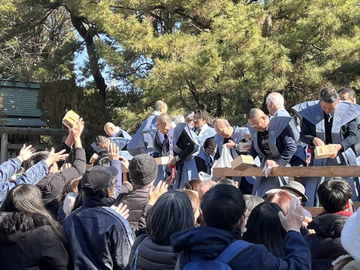 船橋大神宮(船橋市宮本5-2-1)で毎年恒例の「節分祭」が行われ、豆まきでは松戸徹船橋市長や氏子、年男・年女が豆まきに参加し、多くの参拝者が神楽殿の周りに集まった。