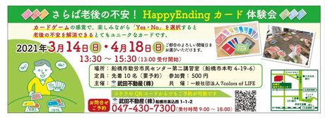 | 内容/詳細 | カードゲームの感覚で、楽しみながら「Yes・No」を選択すると老後の不安が解消できるとてもユニークなカードです。 定員:各日10名(要予約) 主催:武田不動産(株) |