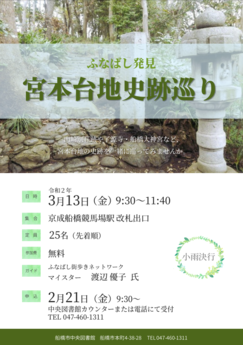 | 内容/詳細 | 中央図書館では、『宮本台地史跡巡り』を行います。 ガイド:渡辺 優子氏(ふなばし街歩きネットワークマイスター) 申込み:25名(先着) |