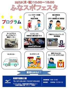 | 内容/詳細 | 【プログラム紹介】 A面 :BEYBLADE X CASUAL BATTLE DAY supported by ミズノ(ベイブレードX 体験会 & 勝ち抜き連勝バトル) 10:00~15:00 ◆野球場 ◆体育館正面・2階ロビー 10:00~15:00 縁日(スーパーボールすくい等) 10:00~15:00 ※12:00~13:00を除く 10:00~15:00 キッチンカー ◆管理事務所2階 第一会議室 |
