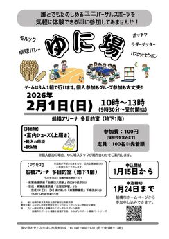 | 内容/詳細 | ユニバーサルスポーツの種目を体験して楽しむ。 【定員】 申込は船橋市ホームページから。 |