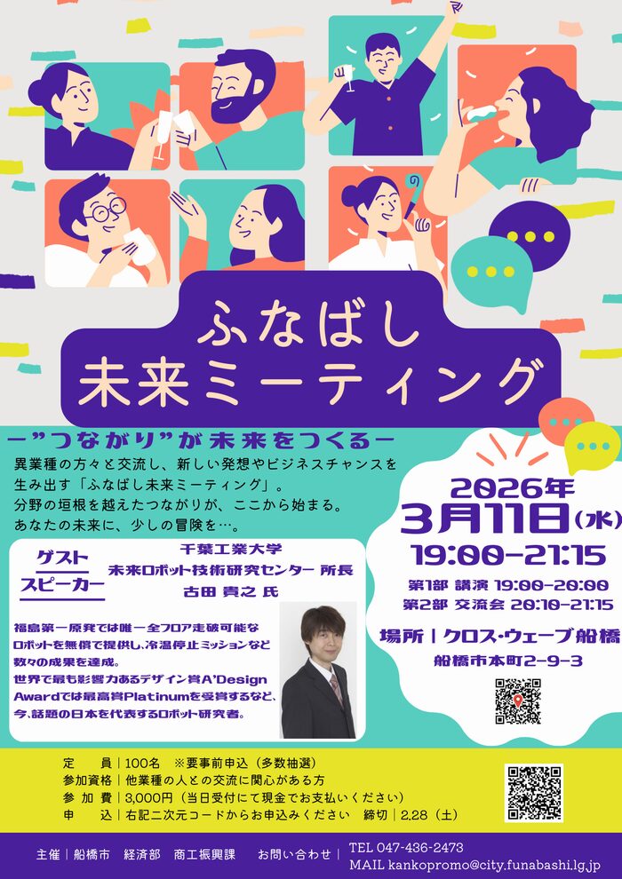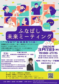 | 内容/詳細 | ー"つながり"が未来をつくるー ゲストスピーカー:古田貴之氏(千葉工業大学 未来ロボット技術研究センター 所長) 第一部:講演(19:00~20:00) 【定員】100名 ※要事前申込(多数抽選) |