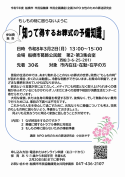 | 内容/詳細 | これからの人生を安心して過ごすために、元気なうちに葬儀についても考え、準備しておくことの大切さを学べる講座。 【内容】 講師:NPO女性のための葬送研究会 小谷あや子 氏 【対象】市内在住・在勤・在学の方 |
