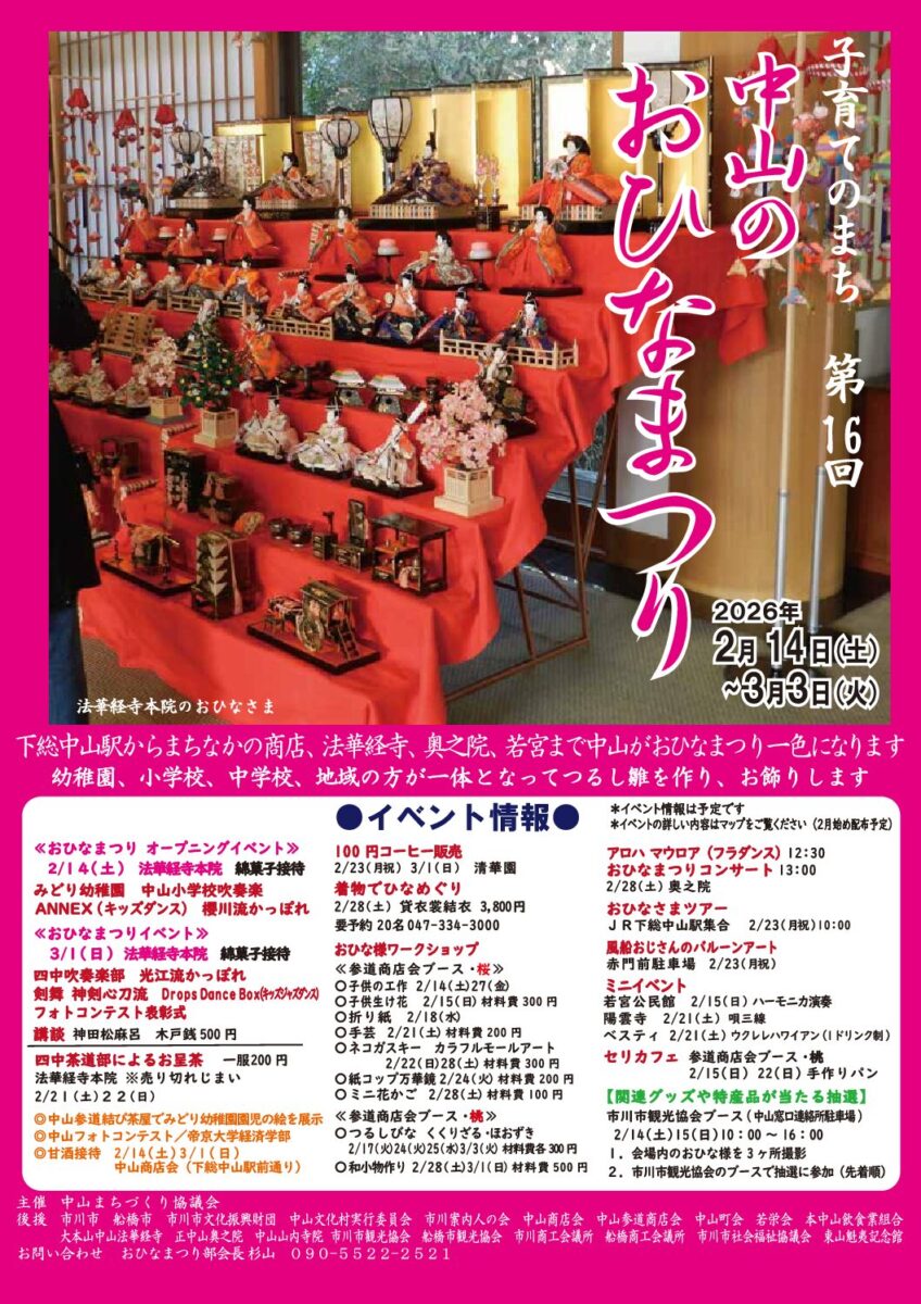 下中山駅からまちなかの商店、法華経寺、奥之院、若宮まで中山がおひなまつり一色に。