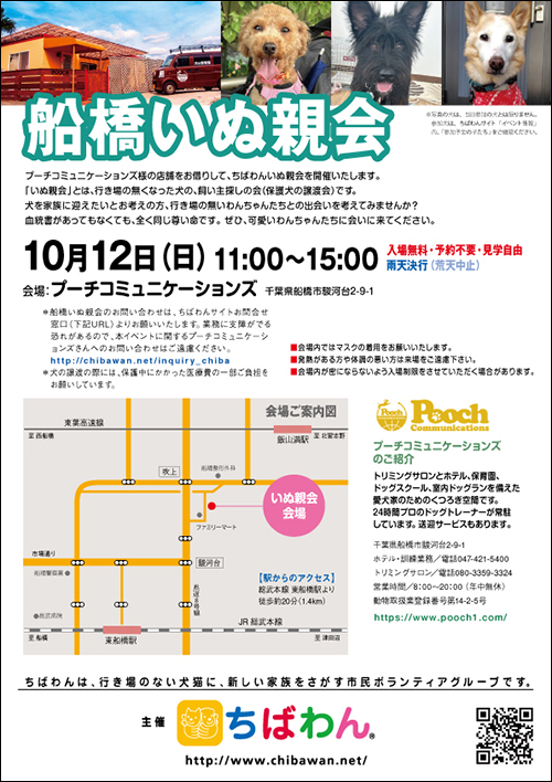 | 内容/詳細 | 10月船橋いぬ親会のご案内です。 【ちばわんからのお願い】 《お知らせ》 ※いぬ親会当日はメールが見られません。また、お問い合わせの際は、必ず「具体的な件名」を入れて多数の迷惑メールと区別がつくようにお願いいたします。 |