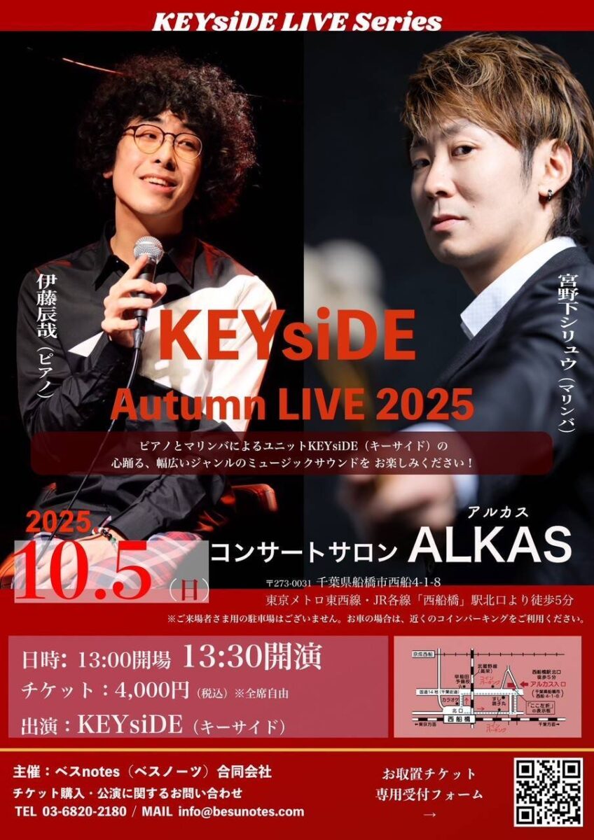 | 内容/詳細 | ピアノとマリンバによるユニットKEYsiDE(キーサイド)の心躍る、幅広いジャンルのミュージックサウンドをお楽しみください! ※全席自由 |